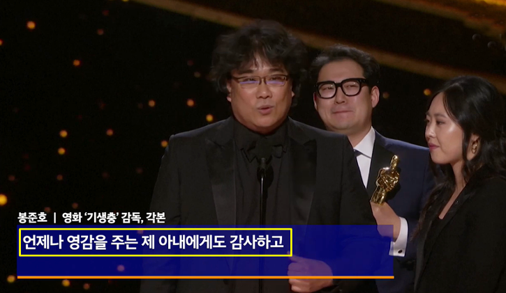 봉준호 감독은 각본상 수상자로 선정되어 처음으로 아카데미 시상식 무대에 오르게 된 순간, 아내에게 고마움을 전했습니다. “언제나 많은 영감을 주는 아내에게 감사합니다”라며 아내에게 전한 말이었습니다.