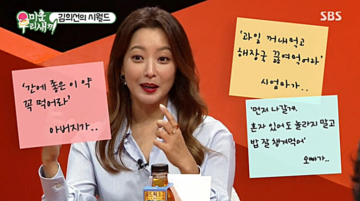 당시 김희선이 술을 마시고 들어오면 시아버지가 간에 좋은 약을 사다 주고 시어머니는 해장국을 끓여주기까지 했다는데요. 결혼 후에도 여전히 애틋한 고부관계를 유지 중인 김희선은 남편 험담을 시어머니와 한다고 밝히기도 했습니다.