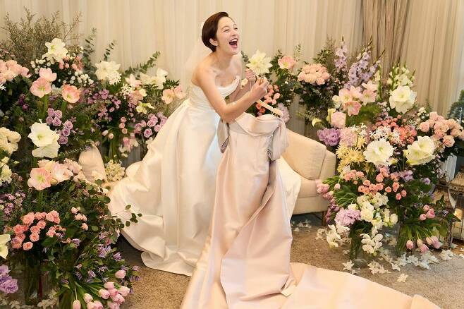 공개된 사진 속에는 아름다운 어깨선을 강조한 웨딩드레스를 입고 행복한 모습을 보이고 있는 황보라의 모습이 담겼습니다.