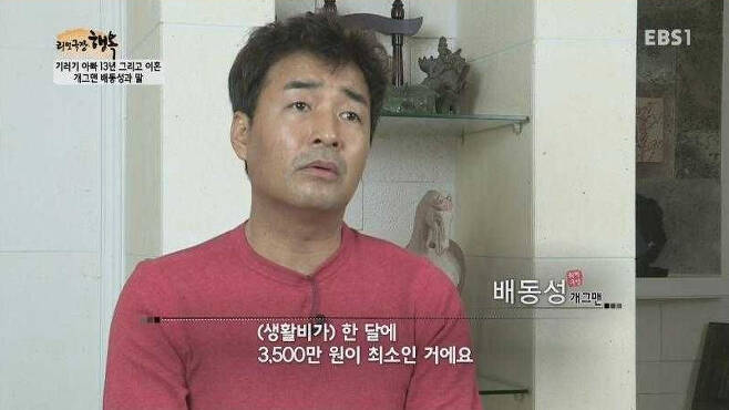 2016년 4월 방송된 ‘기러기 아빠 13년 그리고 이혼, 개그맨 배동성과 딸’ 편에서 배동성은 “일주일 내내 방송만 하며 미국에 월 3500만 원을 보냈다. 매일 100만 원 이상을 벌어도 돈이 모자랐다. 그래도 돈을 보내서 가족들이 편하게 생활할 수 있으면 만족한다고 생각했다”고 13년간 기러기 아빠로 지냈던 시간을 떠올렸습니다.