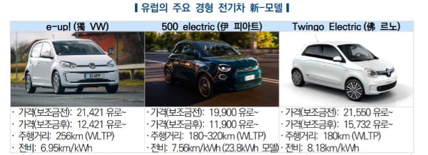 보조금을 포함해 폭스바겐 e-UP은 1만2421유로(약 1700만원), 피아트 500 일렉트릭은 1만1900유로(약 1640만원), 르노 트윙고 일렉트릭은 1만5732유로(약 2160만원)부터 가격대가 형성됐습니다.