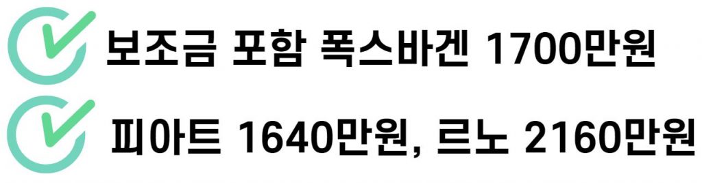 대표적 모델로는 폭스바겐 e-UP, 피아트 500 일렉트릭, 르노 트윙고 일렉트릭 등이 꼽힙니다. 이들 차량 실구매가는 2000만원 내외로 알려져 있습니다.
