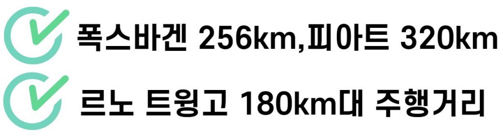 피아트 500 일렉트릭도 1회 충전으로 180~320km(WLTP)를 달립니다. 르노 트윙고 일렉트릭은 180km(WLTP) 주행이 가능합니다.