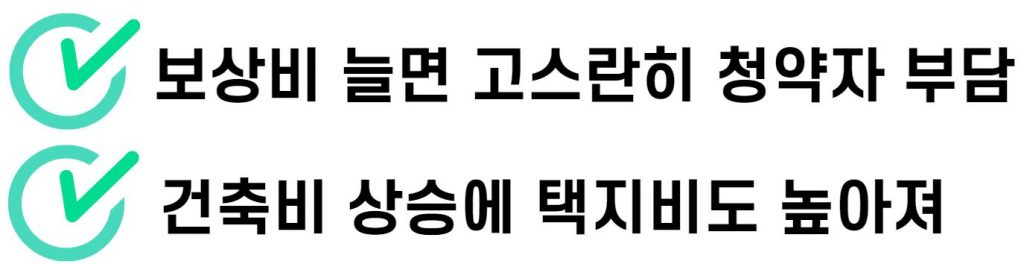 보상비가 늘어나면 그 부담은 아파트를 분양받는 청약자에게 전가될 수밖에 없습니다. 분양가 산정에 반영되는 택지비가 늘어나기 때문입니다.