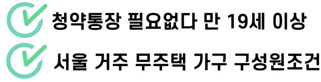 청약 통장이 필요 없고 모집 공고일 기준 서울에 거주하는 만 19세 이상 무주택 가구 구성원이라면 누구나 청약이 가능한것도 매력적입니다.