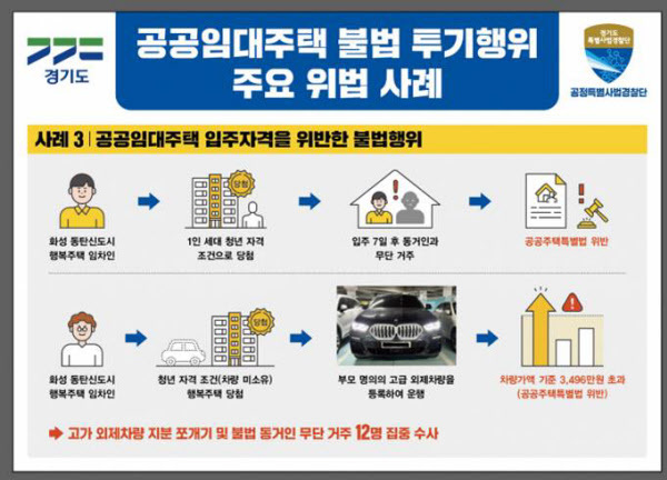 실제로 최근 경기도에선 특별사법경찰단이 한 행복주택 단지에 등록된 외제차 47대를 조사한 결과, 이 중 12대에 지분 쪼개기 편법이 적용된 것으로 적발되기도 했습니다.