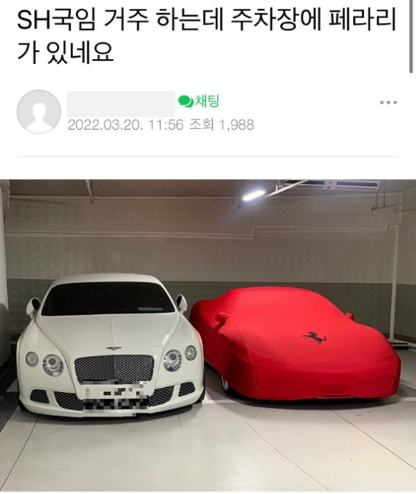 수억원대 고급 스포츠카로 유명한 ‘페라리’와 ‘벤틀리’입니다. 국민임대아파트는 통상 소득이 낮아 주거비를 감당하기 어렵거나 청년·노약자·장애인 등 주거 취약 계층에게 공급하는 단지인데, 초고가의 차량이 주차되어있어서 의아했던것이죠.